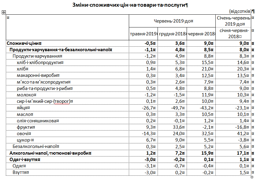 По данным Государственной службы статистики, индекс инфляции (или индекс потребительских цен) в июне 2019 года по отношению к маю составил 99,5 %. А за период январь - июнь 2019 года - 103,6 %.