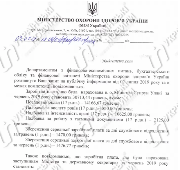По данным Минздрава, точная сумма зарплаты Супрун в июне 2019 года составил 30 713 гривен, из которых должностной оклад - 14 167 гривен, надбавка за выслугу лет - 850 гривен, надбавка за интенсивность труда - 10 625 гривен, надбавка за роботу с секретными документами - 2 125 гривен, командировочные - 2 947 гривен.