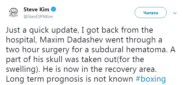 "Дадашеву провели двухчасовую операцию из-за субдуральной гематомы. Чтобы ликвидировать отек пришлось удалить часть черепа. Боксер восстанавливается. О долгосрочных прогнозах сказать ничего не могу", - написал журналист.