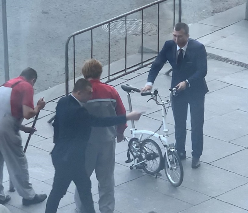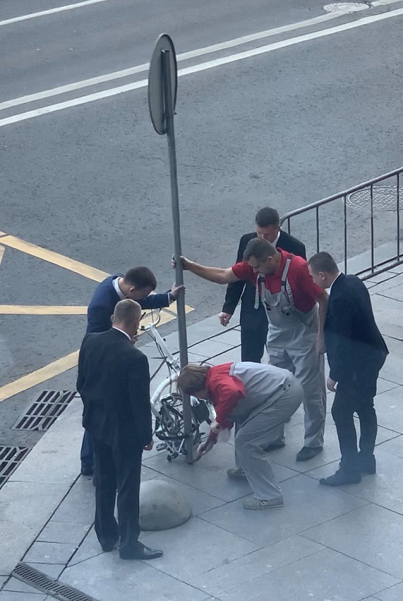 Опубликованы фотографии, на которых охрана пытается отогнать велосипед, пристегнутый тросом к дорожному знаку. После неудавшихся попыток сломать трос или расшатать знак, чтобы вытащить его, охранники позвали рабочего с ломом. После этого велосипед удалось высвободить, и его увезли в сторону входа в здание.
