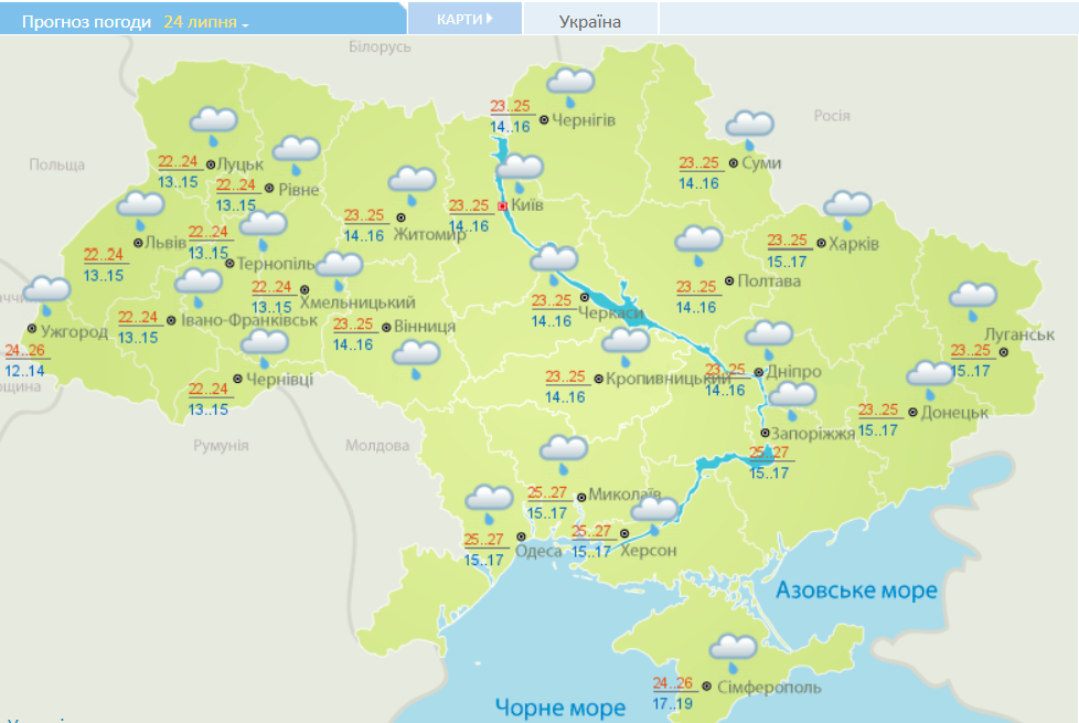 24-25 июля также прогнозируют местами кратковременные дожди с грозами. Температура днем будет +22...+27°, на юге до +28°; ночью - +12...+18°.