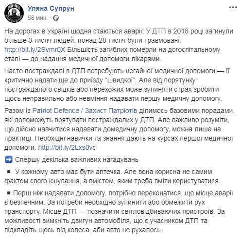 "Возите с собой аптечку и найдите время, чтобы пройти курсы первой помощи. Однажды эти навыки могут спасти кому-то жизнь", - посоветовала глава Минздрава Украины.