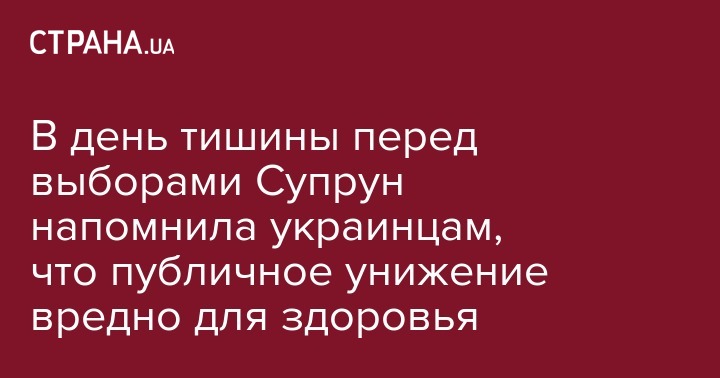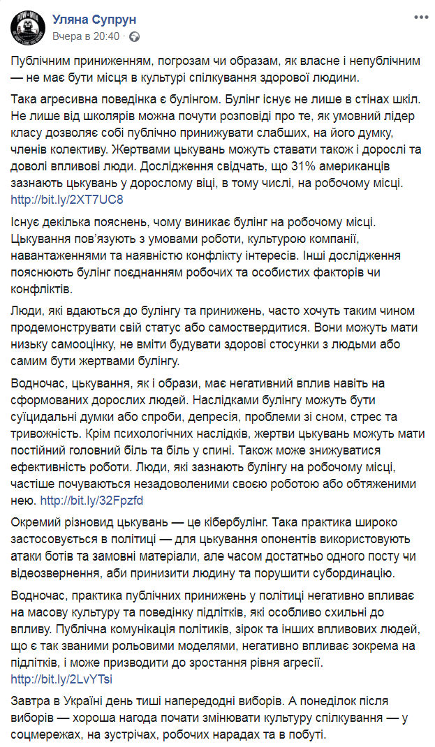 Глава Министерства здравоохранения Ульяна Супрун перед выборами порассуждала о буллинге - то есть публичных унижении и угрозах - среди взрослых. Буллингу она посвятила очередной пост на Facebook.