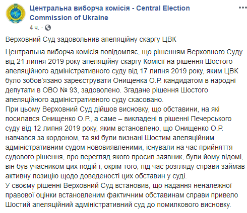 "Решением Верховного Суда от 21 июля 2019 года апелляционную жалобу Комиссии на решение Шестого апелляционного административного суда от 17 июля 2019 года, которым ЦИК обязали зарегистрировать Онищенко А.Р. кандидатом в народные депутаты в ОИО №93, удовлетворено. Упомянутое решение Шестого апелляционного административного суда отменено", - говорится в сообщении.