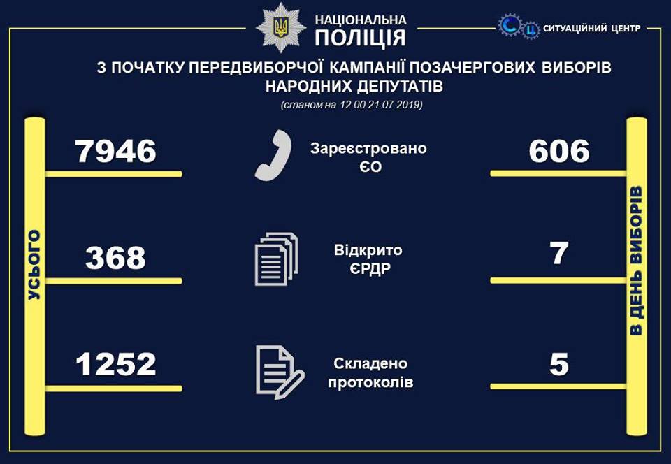 По состоянию на 13:00 21 июля полиция Украины получила более 800 сообщений о нарушениях на парламентских выборах. Об этом сообщает пресс-центр МВД Украины в Facebook.
