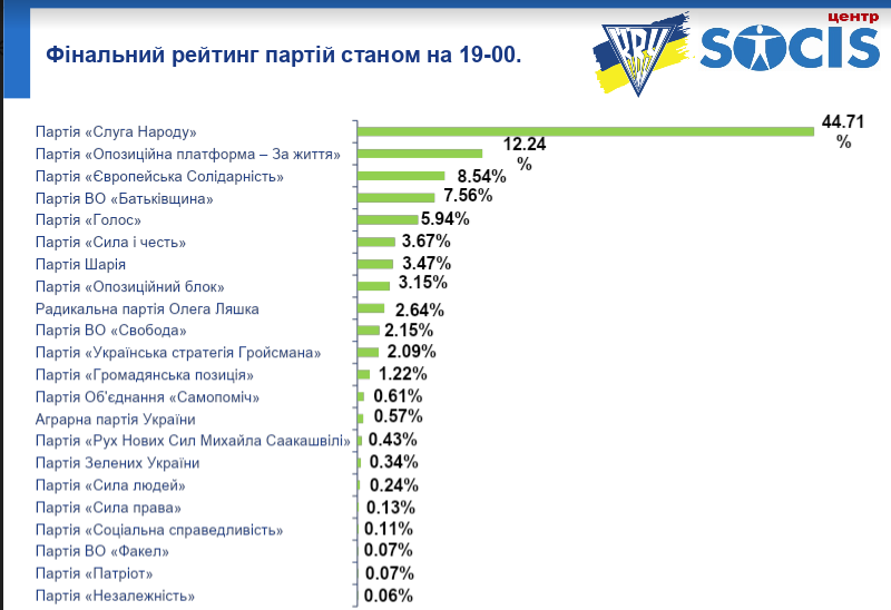 Экзитпол Социс. Слуга народа - 44,71%, Оппоплатформа - 12,24%