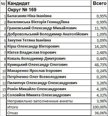 "Вот и результаты заядлой борьбы на 169-м округе. Тот момент когда тройка лидеров постоянно менялась на протяжении кампании. Тот момент, когда некоторых кандидатов то снимали с гонки, то возвращали в нее. Понятное дело, речь идет о результатах экзитпола, а не о подсчитанных ЦИК голосах избирателей. Наслаждайтесь!", - сказано в сообщении.