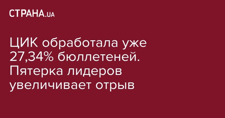 ЦИК обработала уже 27,34% протоколов на выборах в Верховную Раду. Лидеры остаются все те же. В Верховную Раду проходят такие партии - "Слуга народа" (42,03% голосов избирателей), "Оппозиционная платформа - За жизнь" (ОПЗЖ) - 12,64%, "Европейская солидарность" - 8,68%, "Батькивщина" - 8,29%, "Голос" - 6,41%.