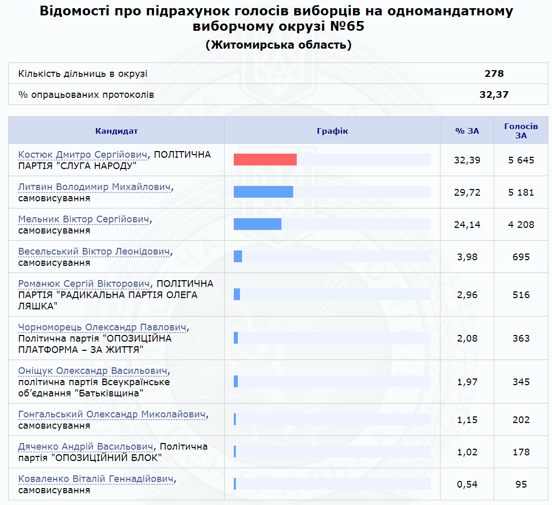 По результатам обработки 32,37% бюллетеней, опытного политика-самовыдвиженца опережает молодой кандидат от партии "Слуга народа" Дмитрий Костюк. 26-летний Костюк набирает 32,39% голосов (5 645 избирателей). За Литвина проголосовали 29,72% избирателей (5 181 человек).