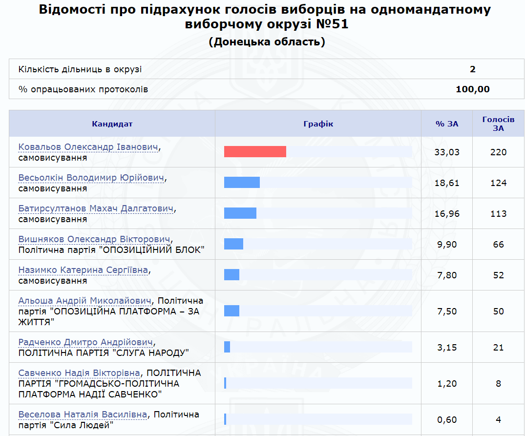 Доля голосов за Савченко среди всех избирателей составила 1,20%. Народного депутата обошел лидер общественной организации "Никто кроме нас" Александр Ковалев. Он выиграл выборную гонку с результатом 220 голосов - 33,03%.