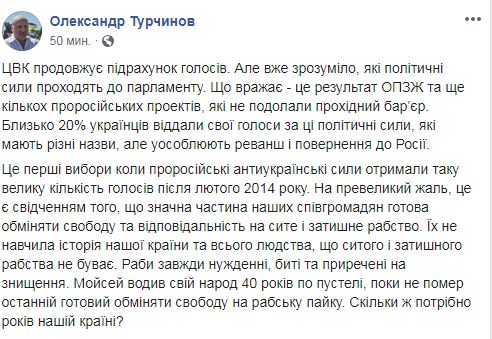 "Что поражает - это результат ОПЗЖ и еще нескольких пророссийских проектов, которые не преодолели проходной барьер. Около 20% украинцев отдали свои голоса за эти политические силы, которые имеют разные названия, но олицетворяют реванш и возвращение в Россию", - написал Турчинов.