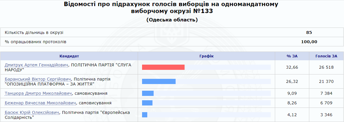 На внеочередных выборах в Верховную Раду по 133 округу в Одесской области победил представитель партии "Слуга народа" мастер спорта международного класса по пауэрлифтингу 26-летний Артем Дмитрук. Об этом свидетельствуют данные ЦИК.