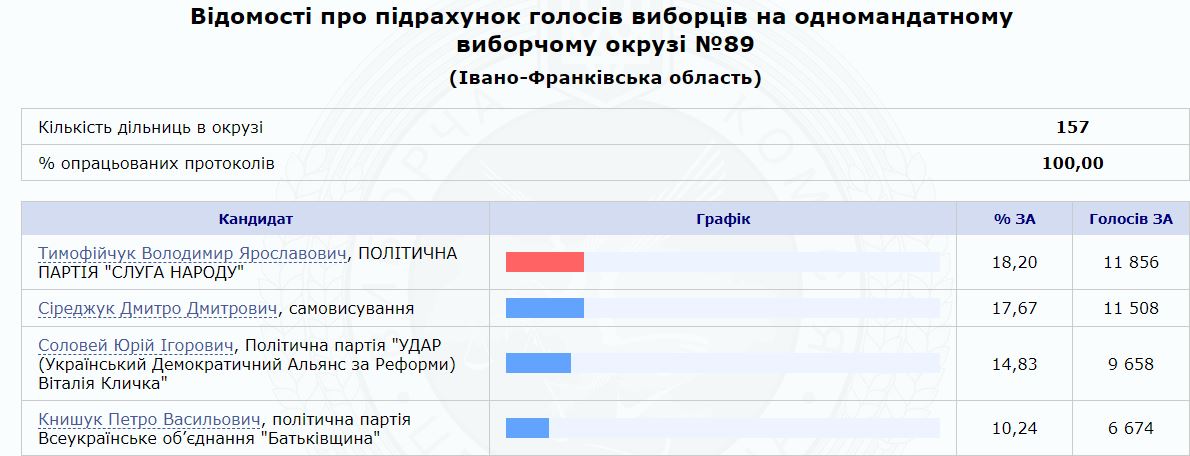 Согласно данным ЦИК, первая тройка соперников шла почти вплотную. В парламент пройдет 33-летний предприниматель Владимир Тимофийчук. Он получил 18,2% голосов (11 856 избирателей). Его ближайший соперник самовыдвиженец Дмитрий Сиреджук набрал 17,67%. На третьем месте - действующий народный депутат от БПП Юрий Соловей - 14,83%.