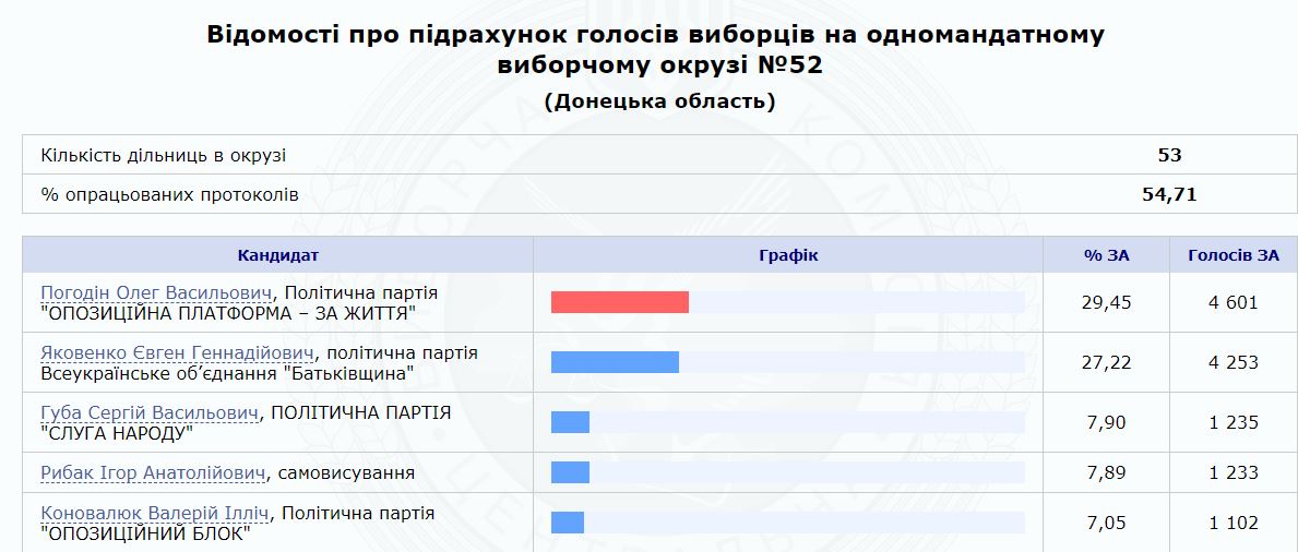 Отметим, что по состоянию на 20:00 по округу обработано всего 54,71% протоколов. По результатам голосования в округе лидирует представитель "Оппозиционной платформы -За жизнь" Олег Погодин с 29,45%, а вот Евгений Яковенко от "Батькивщины" отстает всего на 2,23%.