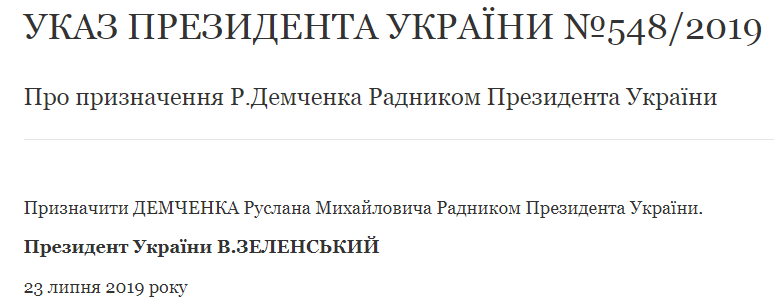 Президент Украины Владимир Зеленский уволил Руслана Демченко с должности советника главы государства и вновь назначил его же на эту же должность.
