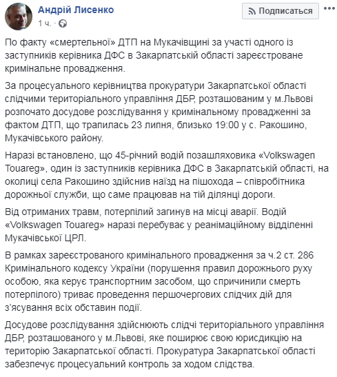"45-летний водитель внедорожника Volkswagen Touareg, один из заместителей руководителя ГФС в Закарпатской области, на окраине села Ракошино совершил наезд на пешехода – сотрудника дорожной службы, который в этот момент работал на том участке дороги", - говорится на FB-странице пресс-секретаря ГПУ Андрея Лысенко.