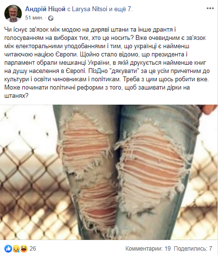 "Существует ли связь между модой на дырявый штаны и прочее тряпье и голосованием на выборах тех, кто это носит? Уже очевидна связь между электоральным предпочтениями и тем, что украинцы являются наименее читающей нацией Европы. Как только стало известно, что президент и парламент выбрали жители Украины, в которой печатается меньше всего книг на душу населения в Европе. Поздно благодарить за это всех причастных к культуре и образованию чиновников и политиков. Надо с этим что-то делать уже. Может начинать политические реформы с того, чтобы зашивать дырки на штанах?" - написал Ницой.
