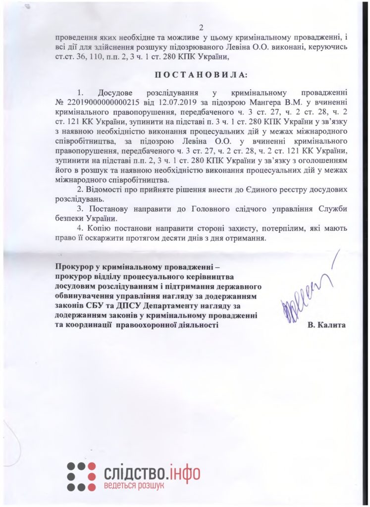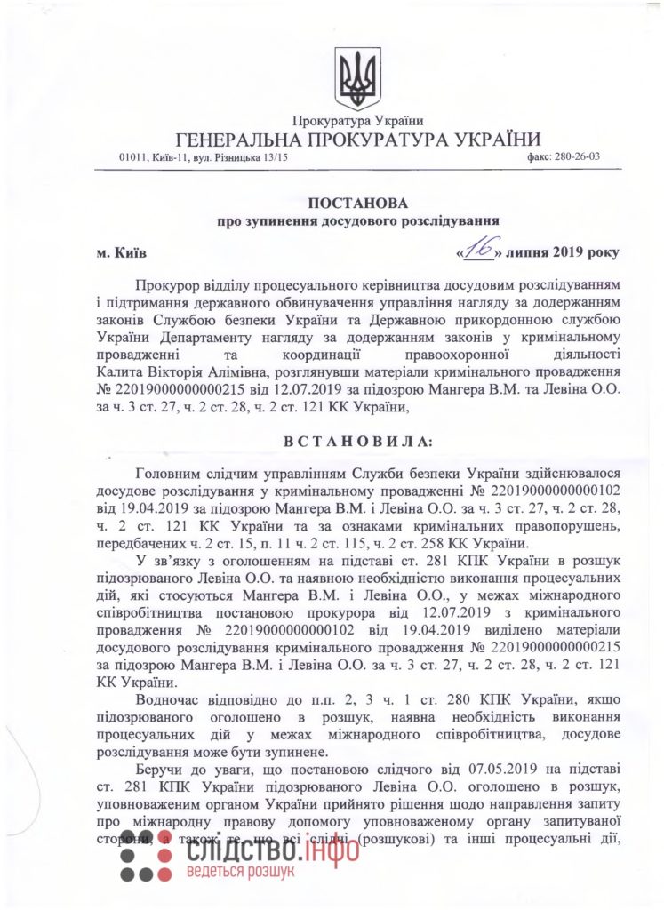 Как свидетельствует документ, ГПУ остановила следствие по главным фигурантам дела Гандзюк еще 16 июля. Генпрокуратура объединила подозреваемых в одно производство и остановила его потому, что Алексей Левин находится в розыске. Дескать, с ним пока нет возможности проводить следственные действия в Украине.