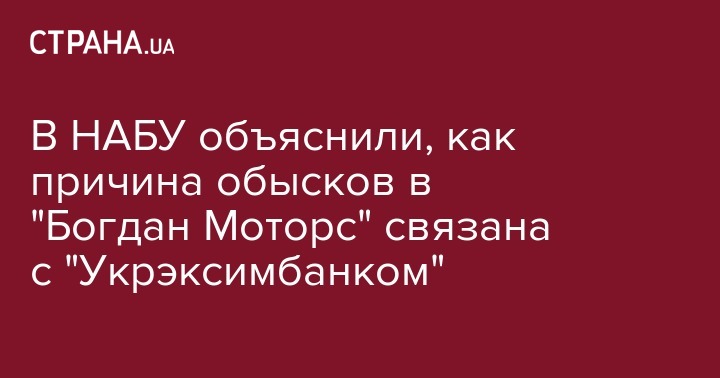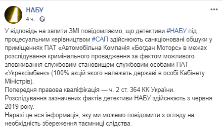 "Детективы НАБУ под процессуальным руководством САП осуществляют санкционированные обыски в помещениях ОАО "Автомобильная Компания "Богдан Моторс" в рамках расследования уголовного производства по факту возможного злоупотребления служебным положением должностными лицами ОАО "Укрэксимбанк", - отметили в НАБУ.