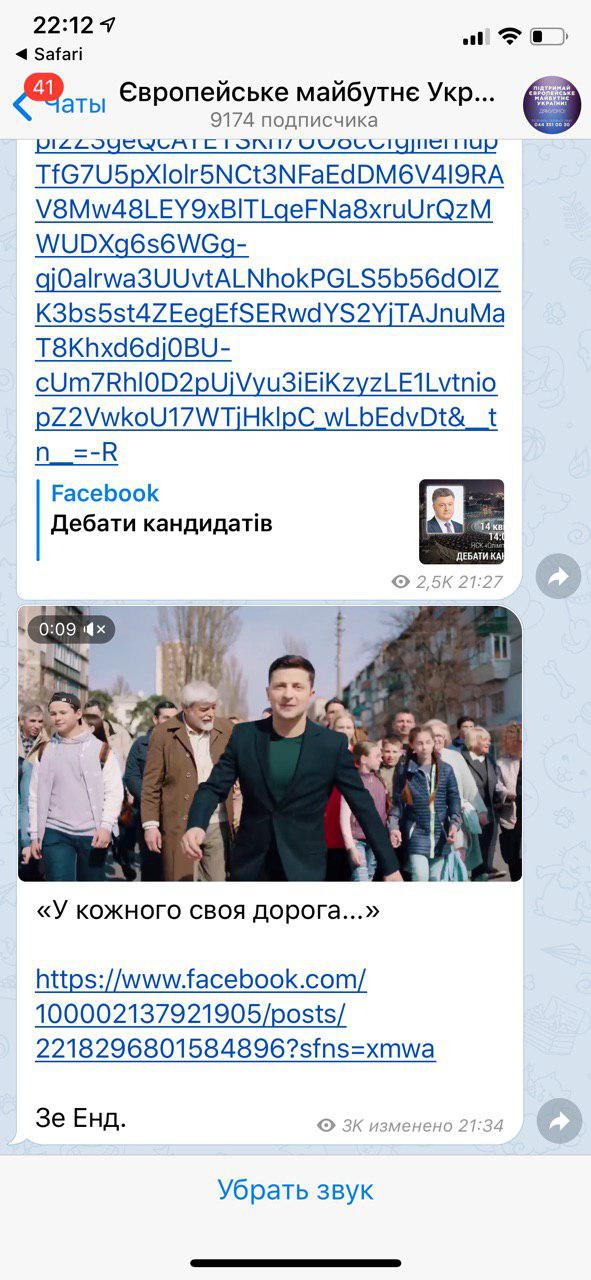 На официальном сайте команды Зеленского тут же отметили этот факт, указав, что канал, на котором появилось видео, связан с Петром Порошенко. Дело в том, что накануне на официальной Facebook-странице Петра Порошенко вышло его обращение. В описании к этой публикации была ссылка, ведущая на сайт euua.org. После регистрации на сайте приходило СМС со ссылкой на Telegram-канал - на нем позже и появилось провокационное видео.