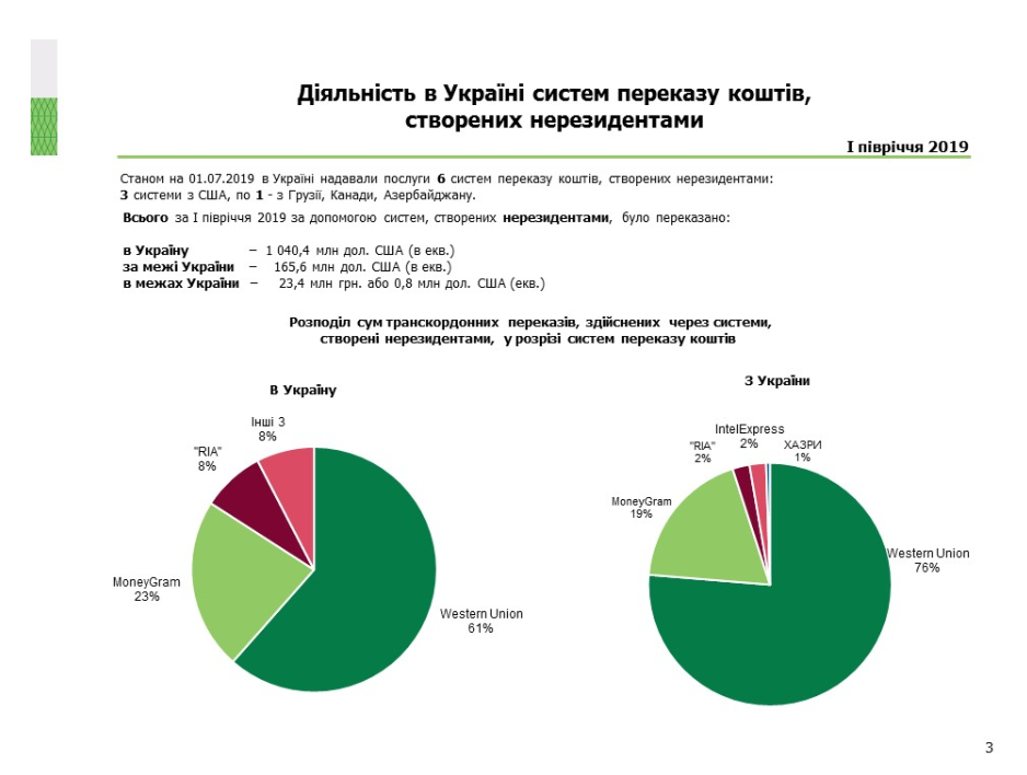 По Украине через системы переводов, созданных нерезидентами, осуществляется совсем малая доля переводов. По данным НБУ, всего 3 процента от общей суммы переводов.