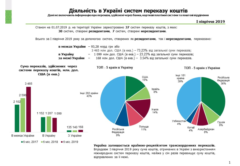 За пределы Украины за первое полугодие 2019 года перевели 168 миллионов долларов (в эквиваленте) - 3,54% от общей суммы переводов, больше всего - на территорию России (36%).