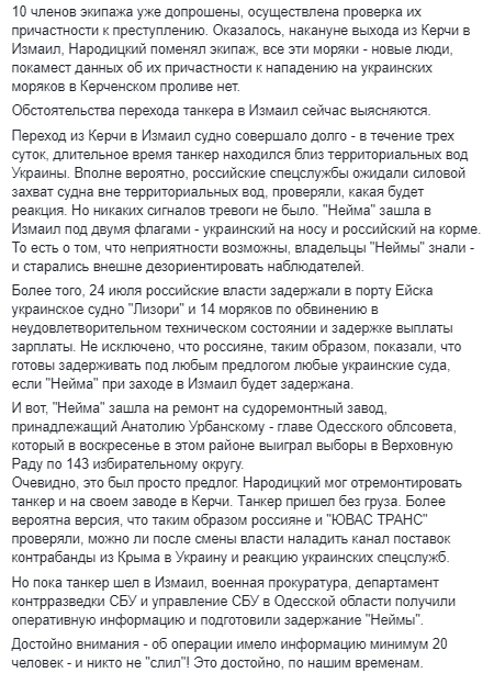 Напомним, 25 июля СБУ сообщила о задержании российского танкера NEYMA, который, по данным спецслужбы, был переименован в NIKA SPIRIT, чтобы скрыть его участие в блокировании украинских судов в Керченском проливе в ноябре 2018 года. Речь об инциденте, когда российские пограничники у берегов аннексированного Крыма обстреляли и захватили три корабля Военно-морских сил Украины: катера "Бердянск", "Никополь" и буксир "Яны Капу", направлявшиеся из Одессы в Мариуполь, а также их экипажи. В плен попали 24 украинца, трое из них были ранены.