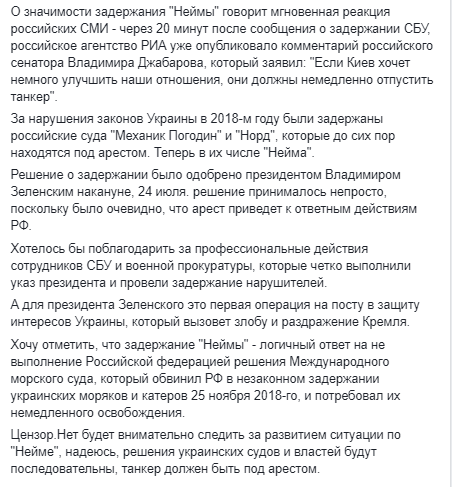 "Решение о задержании было одобрено президентом Владимиром Зеленским накануне, 24 июля. решение принималось непросто, поскольку было очевидно, что арест приведет к ответным действиям РФ. Хотелось бы поблагодарить за профессиональные действия сотрудников СБУ и военной прокуратуры, которые четко выполнили указ президента и провели задержание нарушителей", - написал он.