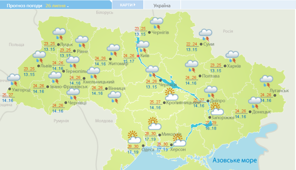 В пятницу, 26 июля, в Украине будет жарко, но с дождями. В зависимости от региона ожидается +23...+30 С. Жарче всего - на курортном юге +28...+30.