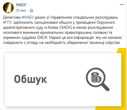 "Детективы Национального антикоррупционного бюро Украины (НАБУ) и сотрудники Управления специальных расследований Генеральной прокуратуры Украины проводят обыски в помещении Окружного административного суда Киева (ОАСК) в рамках расследования возможного совершения уголовных правонарушений главой и отдельными судьями ОАСК", - сказано в сообщении.