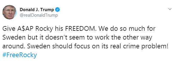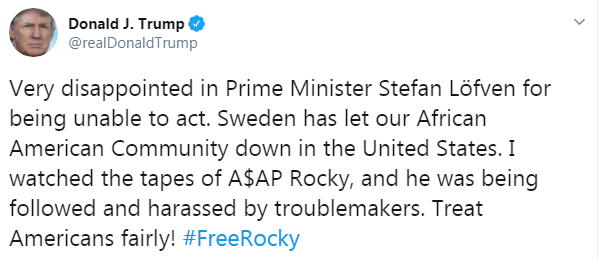 "Очень разочарован премьер-министром (Швеции - прим.ред.) Стефаном Лёфвеном за неспособность действовать. Швеция подвела наше афроамериканское сообщество в Соединенных Штатах. Я смотрел видеозапись (приставаний к реперу - прим. ред.) A$AP Rocky, и за ним следили и приставали хулиганы. Относись к американцам справедливо! #FreeRocky", - говорится в опубликованном сообщении.