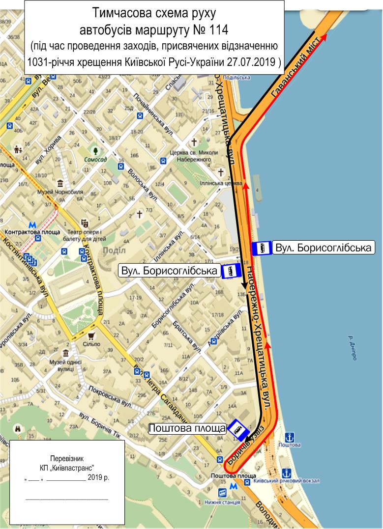 Также изменит маршрут автобус №114. Он будет двигаться от ул. Милославской до Почтовой площади по постоянной схеме, далее Боричев спуск - Почтовая площадь - ул. Набережно-Крещатицкая.