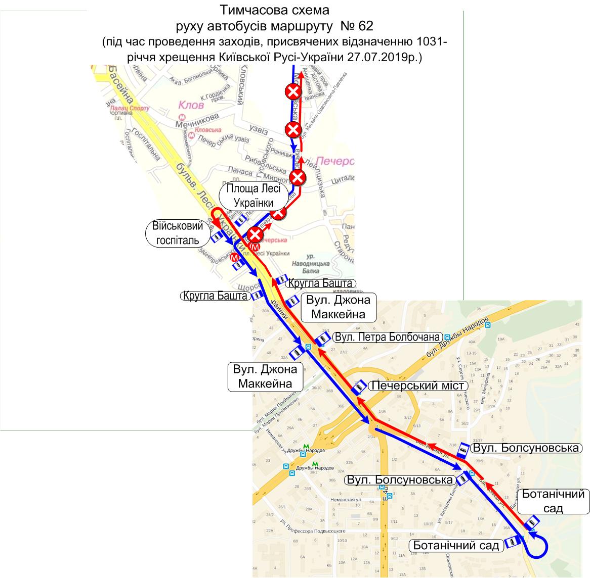 27 июля с 06:00 до 16:30 движение транспорта ограничено по улице Трехсвятительской (от площади Михайловской до Европейской), ул. Крещатик (от ул. Михайловской до Европейской площади), Владимирском спуске (от Почтовой площади до Европейской площади), Парковой дороге (от аллеи Героев Крут до ул. Михаила Грушевского), ул. Михаила Грушевского, ул. Ивана Мазепы (от Арсенальной площади до площади Славы), ул. Лаврской (от площади Славы до ул. Цитадельной).