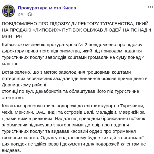 Киевская прокуратура объявила подозрение директору турагентства, который под предлогом оказания туристических услуг завладел более 4 млн грн граждан. Об этом сообщает пресс-служба прокуратуры Киева в Facebook.