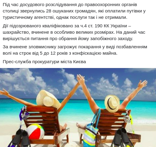 "Установлено, что с целью завладения денежными средствами потерпевших злоумышленник заранее снял офисное помещение в Дарницком районе столицы по ул. Декабристов и обустроил его под туристическое агентство. Во время досудебного расследования в правоохранительные органы столицы обратились 28 обманутых граждан, которые оплатили путевки в туристическом агентстве, однако услуги так и не получили", - сообщает пресс-служба.