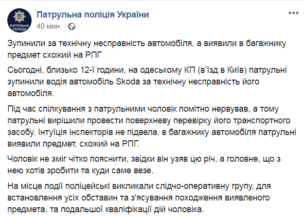 27 июля около 12 часов на одесском контрольном пункте при въезде в Киев патрульные остановили автомобиль Skoda из-за технической неисправности и нашли в нем предмет, похожий на ручной противотанковый гранатомет. Об этом сообщает Facebook-страница Патрульной полиции Украины.