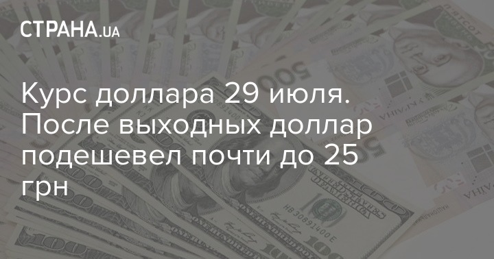 На наличном рынке торговли валютой и на выходных. По сравнению с 26 июля, доллар к 08:00 29 июля подешевел до 25,43 (-9 копеек) при покупке и до 25,51 грн (-7 копеек) - при продаже.