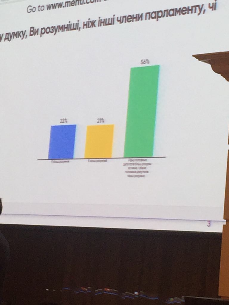 Также слуги народа отвечали, считают ли себя умнее других парламентариев. 22% ответили, что самые умные, 21% – что не такие умные, как другие, а 56% выбрали срединный вариант – что ровно половина парламента умнее их, а другая – менее умная.
