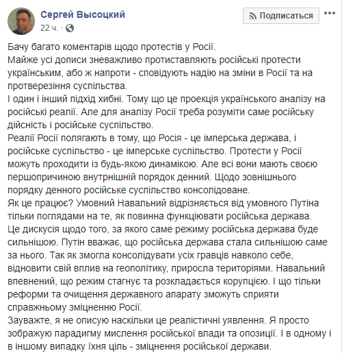 "Вижу много комментариев о протестах в России. Почти все сообщения пренебрежительно противопоставляют российские протесты украинским, или же напротив - исповедуют надежду на перемены в России и на отрезвление общества.