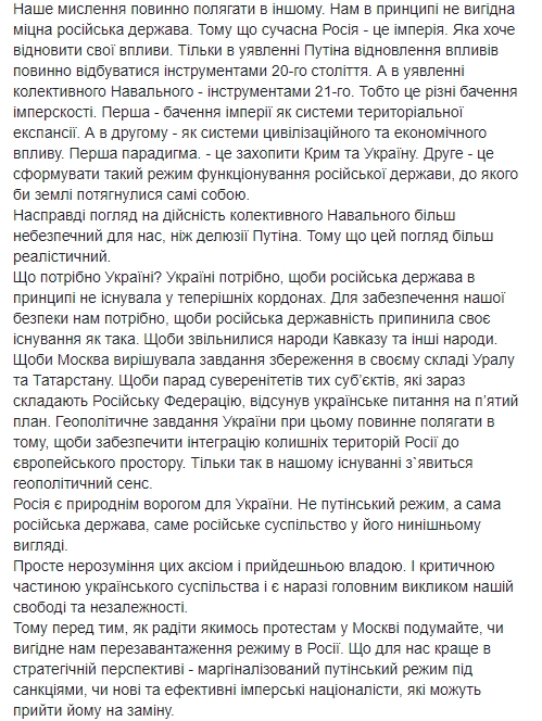 Что нужно Украине? Украине нужно, чтобы российское государство в принципе не существовало в нынешних границах. Для обеспечения нашей безопасности нам нужно, чтобы российская государственность прекратила свое существование как таковая. Чтобы освободились народы Кавказа и другие народы. Чтобы Москва решала задачу сохранения в своем составе Урала и Татарстана. Чтобы парад суверенитетов тех субъектов, которые сейчас составляют Российскую Федерацию, отодвинул украинский вопрос на пятый план. Геополитическая задача Украины при этом должна заключаться в том, чтобы обеспечить интеграцию бывших территорий России в европейское пространство. Только так в нашем существовании появится геополитический смысл.