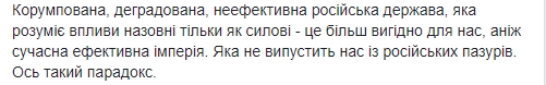 Коррумпированное, деградированное, неэффективное российское государство, понимающее влияние наружу только как силовое - это более выгодно для нас, чем современная эффективная империя. Которая не выпустит нас из российских когтей. Вот такой парадокс".