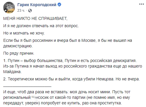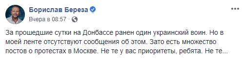"За прошедшие сутки на Донбассе ранен один украинский воин. Но в моей ленте отсутствуют сообщения об этом. Зато есть множество постов о протестах в Москве. Не те у вас приоритеты, ребята. Не те..."