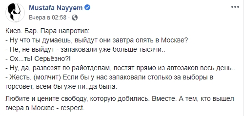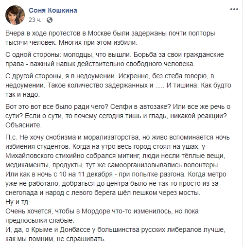 "Удивляют меня наши же братья-украинцы. Весь вчерашний вечер лента пестрела словами соболезнования и поддержки по отношению к москвичам, которых вчера била и задерживала российская полиция.