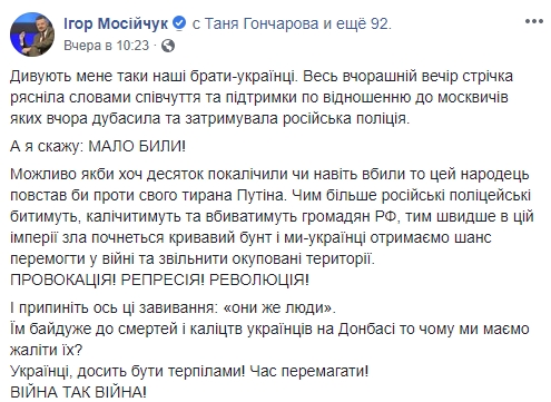 Нардеп Игорь Мосийчук заявляет, что россиян на улицах Москвы надо было избить еще сильнее: