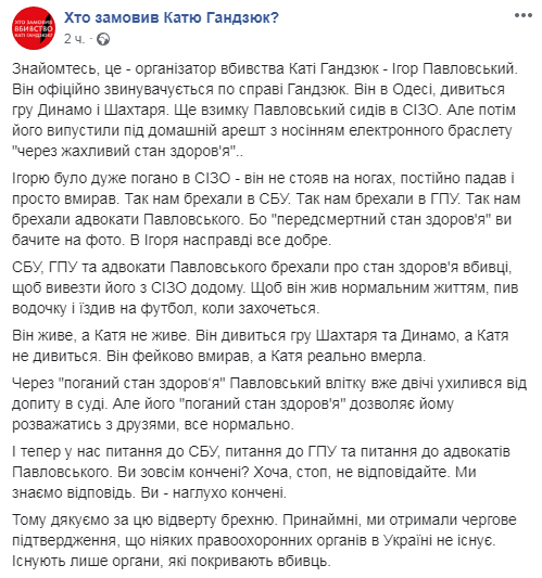 "Знакомьтесь, это - Игорь Павловский. Он официально обвиняется по делу Гандзюк. Он в Одессе, смотрит игру Динамо и Шахтера. Еще зимой Павловский сидел в СИЗО. Но потом его выпустили под домашний арест с ношением электронного браслета "из-за ужасного состояния здоровья", - говорится в сообщении сообщества "Кто заказал Гандзюк?".