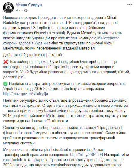 "Недавно советник Президента по вопросам здравоохранения Mihail Radutsky дал пространное интервью газете “Ваше здоровье”, которая, кстати, принадлежит семье Загорий (владельцам одного из крупнейших фармацевтических бизнесов в Украине). Благодарна Михаилу за возможность в очередной раз напомнить украинцам об уже сделанном командой Министерства здравоохранения Украины и опровергнуть распространенные мифы и манипуляции, которыми переполнен упомянутый материал", - написала Супрун.