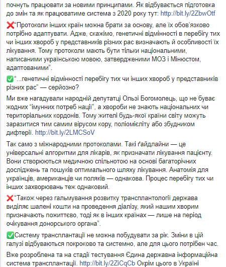 "Мы уже напоминали народному депутату Ольге Богомолец, что не бывает никаких “иммунных потребностей нации”, а болезни не знают национальных или территориальных границ. Поэтому жители любой страны мира могут заразиться тем же вирусом кори, полиомиелита или возбудителем дифтерии. Так же с международными протоколами. Такие гайдлайны — это универсальные алгоритмы для врачей, как назначать лечение пациенту. Они создаются медицинским сообществом на основе многолетних исследований и поисков оптимального пути лечения. Анатомия для украинцев, американцев или поляков — одинаковая. Процесс течения тех или иных заболеваний тоже одинаковый", - написала Супрун.