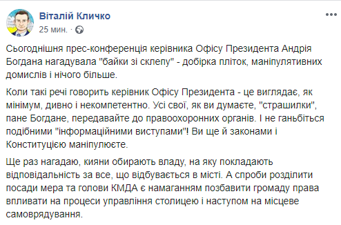 Байками из склепа, сплетнями и манипулятивными домыслами назвал мэр Киева Виталий Кличко информацию, озвученную на сегодняшнем брифинге главой Офиса президента Украины Андреем Богданом. Такое заявление столичный градоначальниу сделал на своей странице в соцсети.