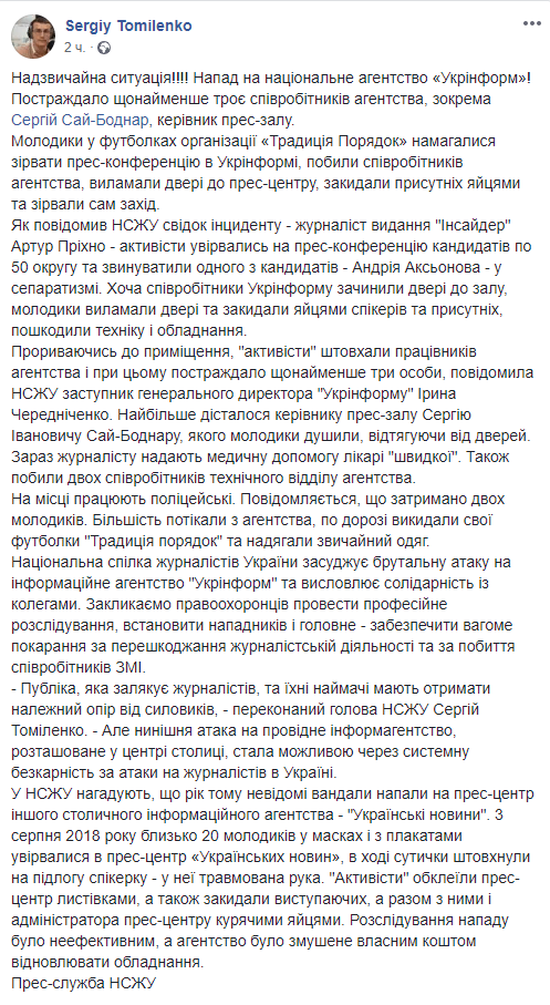 "Парни в футболках организации «Традиция и порядок» пытались сорвать пресс-конференцию в Укринформе, избили сотрудников агентства, выломали двери в пресс-центр, забросали собравшихся яйцами и сорвали само мероприятие ... Но нынешняя атака на ведущее информагентство, расположенное в центре столицы, стала возможной из-за системной безнаказанности атак на журналистов в Украине ", - считает Томиленко.