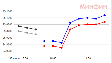К 11:00 31 июля покупка 24,55-24,8, продажа 25,00-25,3 грн.